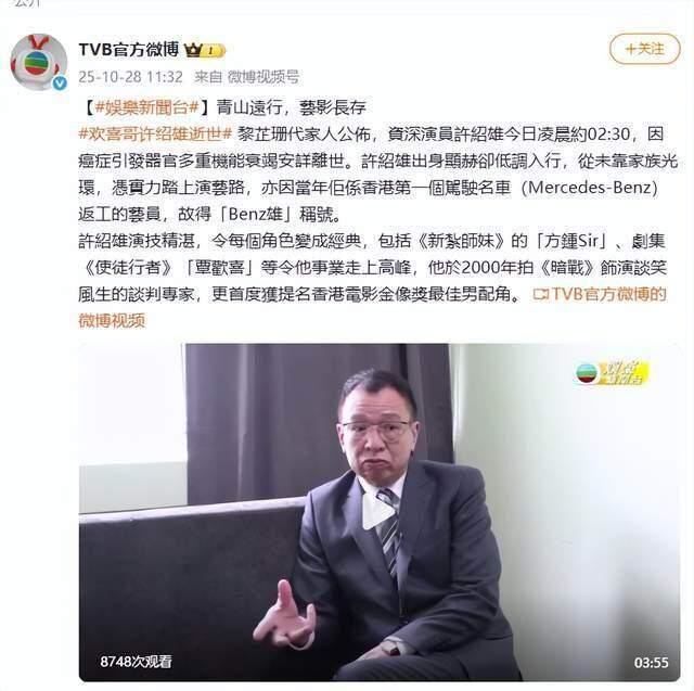 10月28日,@TVB官方微博发文悼念许绍雄:青山远行,艺影长存。